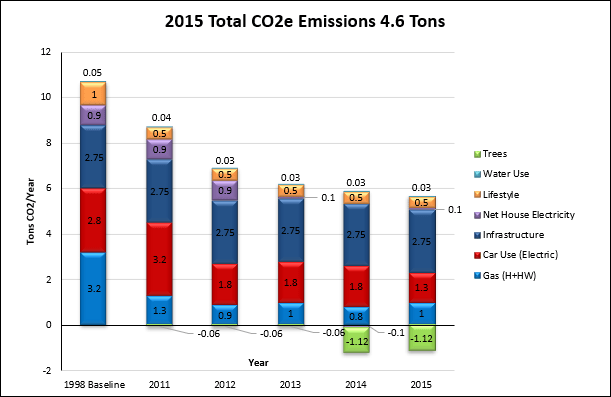 The energy supplier was changed to a different 100% renewable generator, Ecotricity. This provided a better tariff for charging the BEV, and enabled investment in a green bond to fund building of new renewable generation assets like wind and solar farms. A further investment was made in Thrive Renewables for the same reason. These did not affect the results for lifestyle in the carbon footprint calculator (WWF, 2016), so emissions remained at 0.5 tCO2.