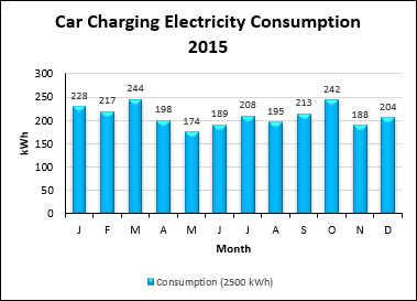 The car in use was now a battery electric vehicle (BEV), shown in Fig.5. The annual mileage had also increased by 50% in this year, and estimated to the nearest 1000 was given as 12000 miles, or 19000 km. As the fuel is electricity, the carbon intensity figure of fuel production and use in an electric vehicle is the same as is given for grid electricity, which this year was 0.5 kgCO2e/kWh (DECC, 2015) for a 2015 generation mix. The car consumed 2500 kWh of electricity to charge, derived from monthly readings of the night time consumption meter and shown as a column chart in Fig.6. This resulted in fuel production emissions only, and a reduction of 31% or 570 kgCO2e to 1250 kgCO2e or 1.3 tCO2e.