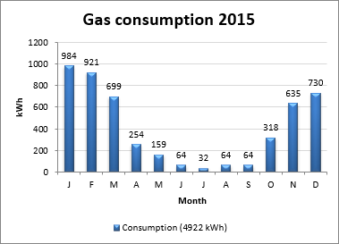 Total annual household gas consumption increased by 21% to a more typical level of 4922 kWh, compared to the previous year’s low, derived from monthly meter readings, shown as a column chart in Fig.4. All consumption was provided by the gas grid, and given a carbon intensity figure of 0.205 kgCO2e/kWh (DECC, 2015). This resulted in an increase of 172kgCO2e to 1009 kgCO2e or 1.0 tCO2e emissions.