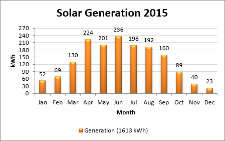 The total solar power generation for the year increased slightly by 20 kWh to 1613 kWh, derived from reading the generation meter. The monthly solar generation data are shown in Fig.2.