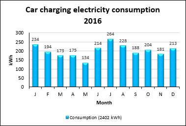 The car in use was a battery electric vehicle (BEV). The annual mileage estimated to the nearest 1000 decreased to 11000 miles, or 18000 km. As the fuel is electricity, the carbon intensity figure of fuel production and use in an electric vehicle is the same as is given for grid electricity, which this year was 0.449 kgCO2e/kWh (DECC, 2016) for a 2016 generation mix. The car consumed 2402 kWh of electricity to charge, derived from monthly readings of the night time consumption meter and shown as a column chart in Fig.5., resulting in fuel production emissions only of 1079 kgCO2e or 1.1 tCO2e.
