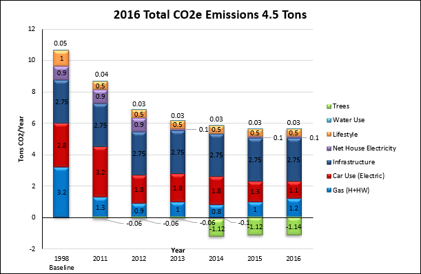There was an overall emissions reduction of 2% or 0.1 tCO2e compared to the previous year, and 58% or 6.2 tCO2e compared to the baseline year. There were reductions in grid consumption and vehicle travel emissions, in part due to a lower emission factor for grid electricity as more renewable generators were added to the mix. However, these were cancelled out by lower solar generation and higher gas consumption. There was also a slight decrease in water use, which does not show in the fingerprint.The actual difference between the 2015 and 2016 footprints was the 20 kgCO2 sequestered from the planting of two trees, and this resulted in a rounding down of the footprint by the 0.1 tCO2e figure.