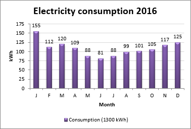 Total annual household electricity grid consumption was reduced on the previous year by 127 kWh or 9% to 1300 kWh, again derived from reading the electricity meter. The monthly grid electricity consumption data are shown in Fig.3.
