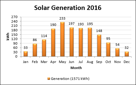 The total solar power generation for the year decreased by 72 kWh to 1541 kWh, derived from reading the generation meter. The monthly solar generation data are shown in Fig.2.