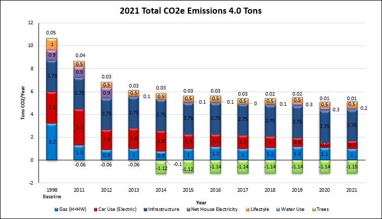 Overall, emissions remained stable compared to the previous year, and 63% or 6.7 tCO2e lower compared to the baseline year. Small decreases in emissions for gas consumption and net household electricity use, and further sequestration from added vegetation, were cancelled out by an increase in emissions for car travel as normal mileage resumed compared to the pandemic lock-down restrictions of the previous year. In addition, below average solar generation was countered by a reduction in electricity use.