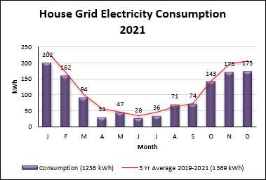 Total annual household electricity grid consumption was reduced on the previous year by 260 kWh or 17% to 1236 kWh, again derived from reading the electricity meter. The monthly grid electricity consumption data are shown in Fig.3.
