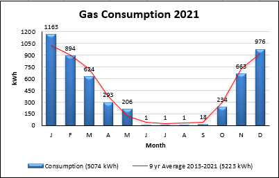 Total annual household gas consumption decreased by 8% on the previous year to 5074 kWh, derived from monthly meter readings, shown as a column chart in Fig.4. All consumption was provided by the gas grid, and given a carbon intensity figure of 0.203 kgCO2e/kWh (DECC, 2021). This resulted in a decrease of 95kgCO2e to 1030 kgCO2e or 1.0 tCO2e emissions.