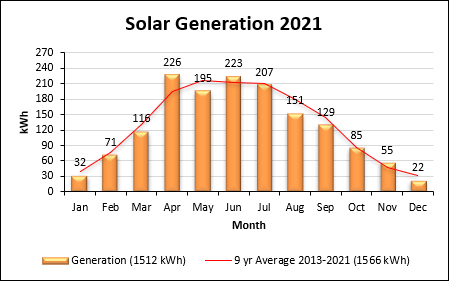 The total solar power generation for the year decreased slightly by 47 kWh to 1512 kWh, derived from reading the generation meter. The monthly solar generation data are shown in Fig.2. Annual generation was lower than the nine-year average, but monthly generation showed a typical pattern apart from a high reading for April.