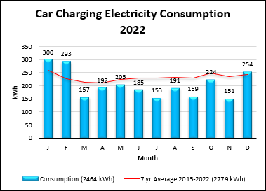 The car in use was a battery electric vehicle (BEV). The annual mileage estimated to the nearest 1000 decreased on the previous year to 12000 miles, or 19000 km. As the fuel is electricity, the carbon intensity figure of fuel production and use in an electric vehicle is the same as is given for grid electricity, which this year was 0.211 kgCO2e/kWh (DECC, 2022) for a 2022 generation mix. The car consumed 2464 kWh of electricity to charge, derived from monthly readings of the night time consumption meter and shown as a column chart in Fig.8., resulting in a decrease in fuel production emissions only to 520 kgCO2e or 0.5 tCO2e.
