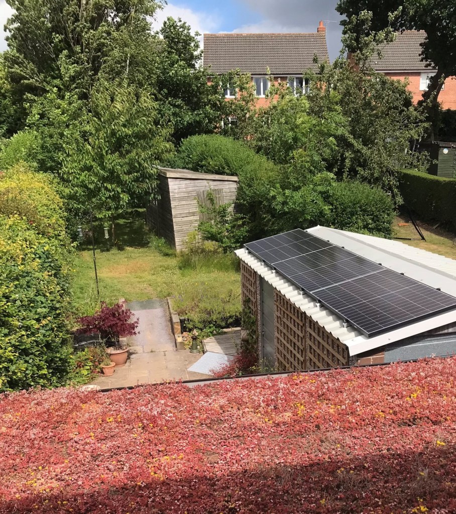 Fig.3. The secondary 1 kWp solar array on the south-west facing garage roof. Maturing planted trees and green roof are also in view.