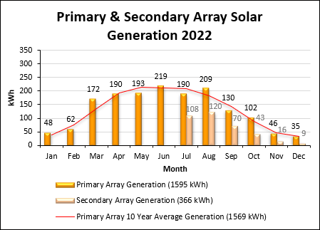 The total solar power generation for the year increased by 449 kWh to 1961 kWh, mainly due to the new 1 kW secondary array shown in Fig.3., but also higher solar irradiance. Data were derived from reading the generation meters. The monthly solar generation data are shown in Fig.2.