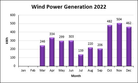 The total wind power generation from my ownership share in the Graig Fatha turbine (Fig.5.), for this part-year was 3195 kWh, displacing this amount of conventional grid electricity generation with carbon intensity of 0.211 kgCO2e/kWh (DECC, 2022) for a 2022 generation mix. This resulted in an emission off-set of 674 kgCO2e or 0.7 tCO2e. The monthly wind generation data were derived from my personal Ripple dashboard, and are shown in Fig.4.