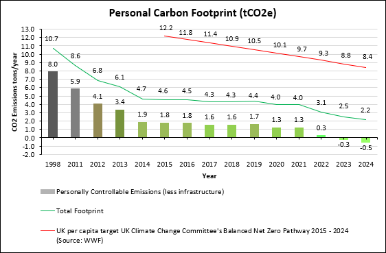 Overall, by 2024 total carbon emissions have been reduced by 79% or 8.5 tCO2e per year compared to the 1998 baseline year, from 10.7 tCO2e to 2.2 tCO2e. For context, this is less than a 2030 global per-capita footprint target aligned with the Paris Agreement somewhere in the region of 2.3 tCO2e (WWF, 2023). Furthermore, personally controllable emissions, omitting infrastructure, produced a carbon negative figure of -0.5 tCO2e per year. The chart in Fig.1. shows the carbon emissions reduction over the period, comparing the total footprint, personally controllable emissions, and the UK per capita target according to The World-Wide Fund for Nature (WWF) carbon footprint calculator. This calculator also suggests the average carbon footprint for my area is 11.3 tCO2e per person.